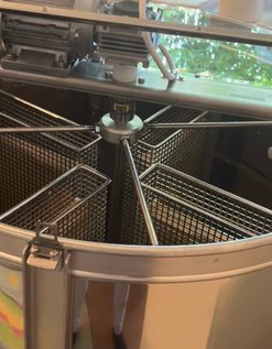 Wir schleudern unseren Honig mit einer Vier-Waben-Selbstwendeschleuder.