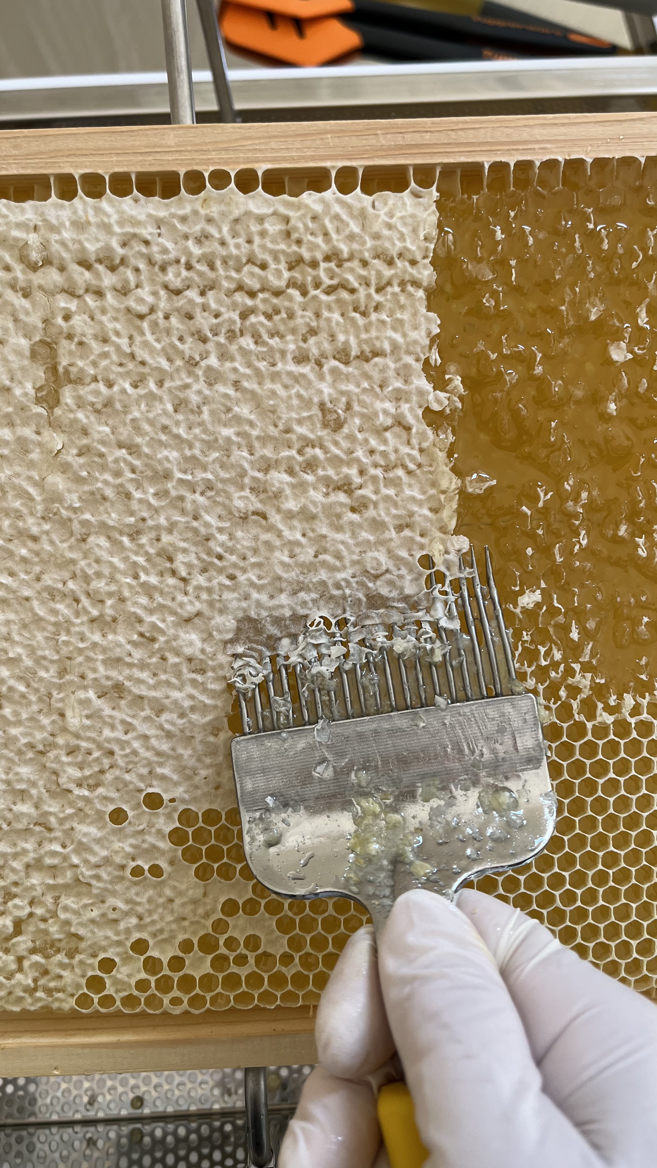 Vor dem Schleudern der Rähmchen müssen die Waben entdeckelt werden. Wir verwenden dafür eine sogenannte Entdeckelungsgabel.